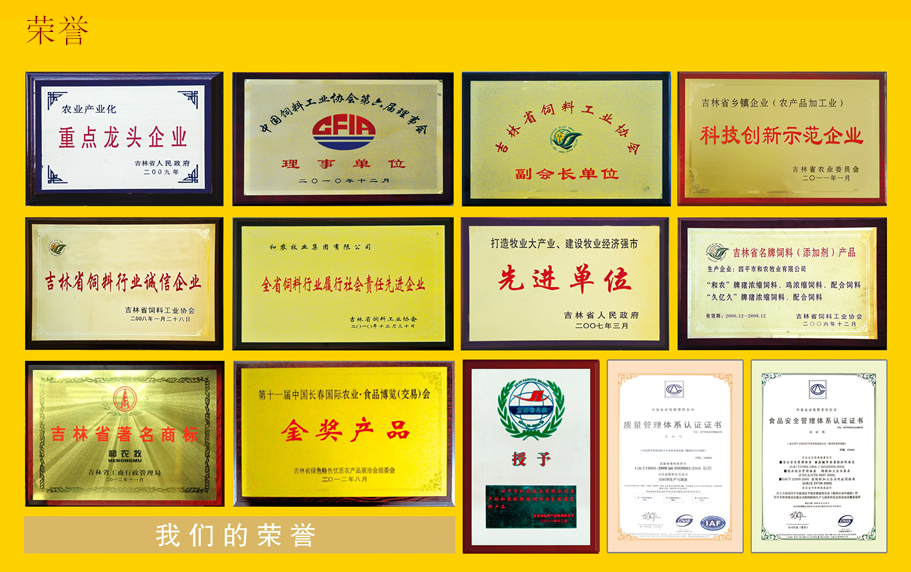 集團(tuán)先后被評為吉林省農(nóng)業(yè)產(chǎn)業(yè)化重點(diǎn)龍頭企業(yè)、牧業(yè)生產(chǎn)先進(jìn)企業(yè)、吉林省飼料行業(yè)誠信企業(yè)、吉林省科技創(chuàng)新示范企業(yè)、吉林省科技創(chuàng)新先進(jìn)企業(yè)、吉林省飼料協(xié)會會長單位、中國飼料工業(yè)協(xié)會理事單位,“和農(nóng)”品牌榮獲“吉林省名牌飼料產(chǎn)品”與“吉林名牌”稱號、吉林省著名商標(biāo)。創(chuàng)業(yè)先后通過了“ISO9001:2008質(zhì)量管理認(rèn)證”和“HACCP食品安全認(rèn)證和農(nóng)乳豬奶料、保育豬配合飼料、蛋王飼料連年榮獲中國農(nóng)業(yè)食品博覽會金獎。