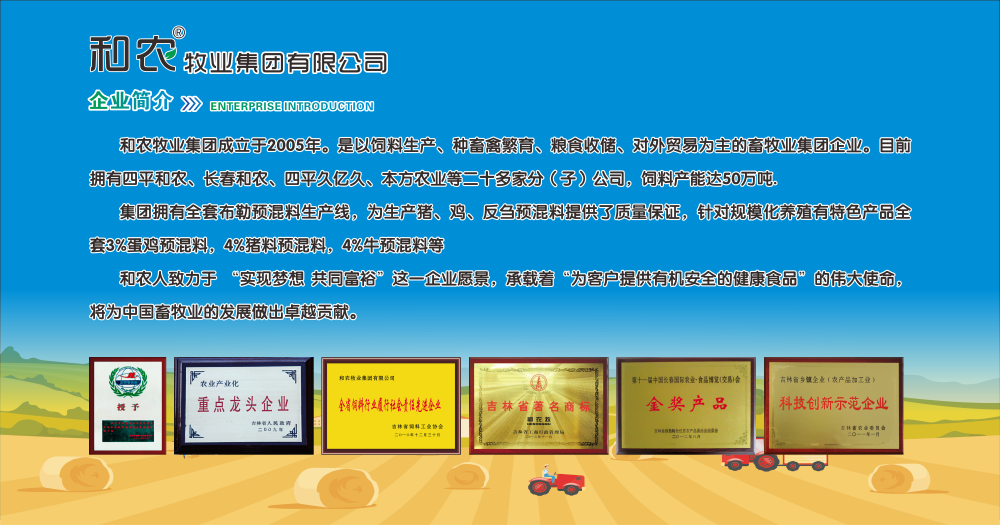 和農(nóng)牧業(yè)集團(tuán)成立于2005年,是以飼料生產(chǎn)、種畜禽繁育、糧食收儲、對外貿(mào)易為主的畜牧業(yè)集團(tuán)企業(yè)。飼料產(chǎn)能達(dá)50萬噸,集團(tuán)擁有全套布勒預(yù)混料生產(chǎn)線,為生產(chǎn)豬、雞、反芻預(yù)混料提供了質(zhì)量保證,針對規(guī)?;B(yǎng)殖有特色產(chǎn)品全套3%蛋雞預(yù)混料,4%豬料預(yù)混料,4%牛預(yù)混料等。